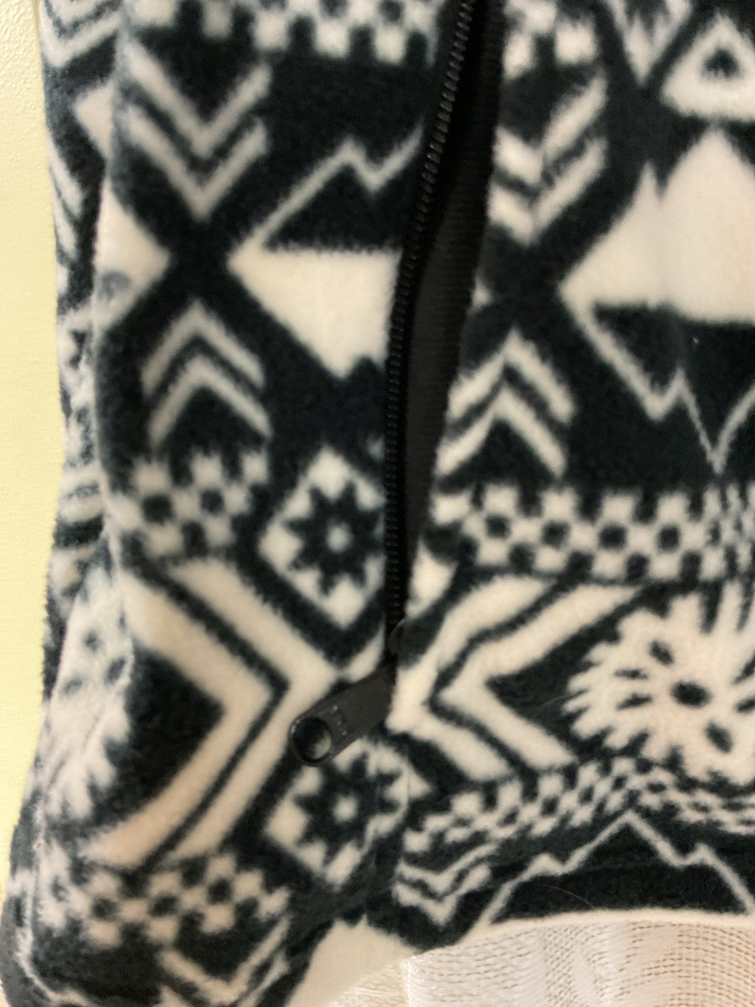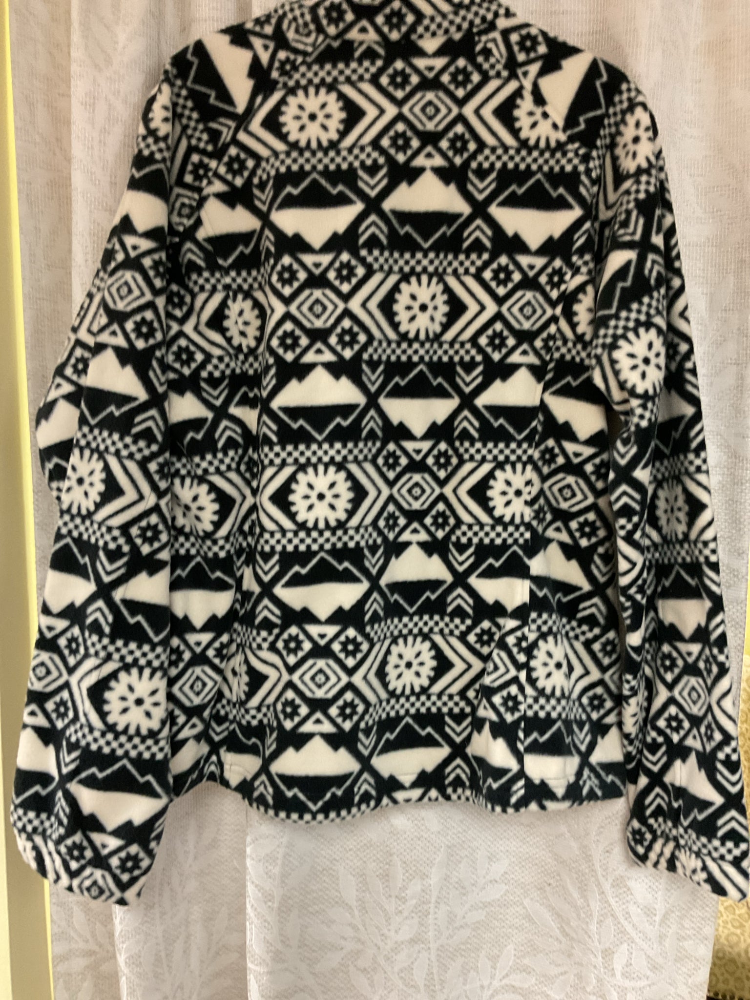 New black and white fleece. Measures 23" across the chest and 26" long